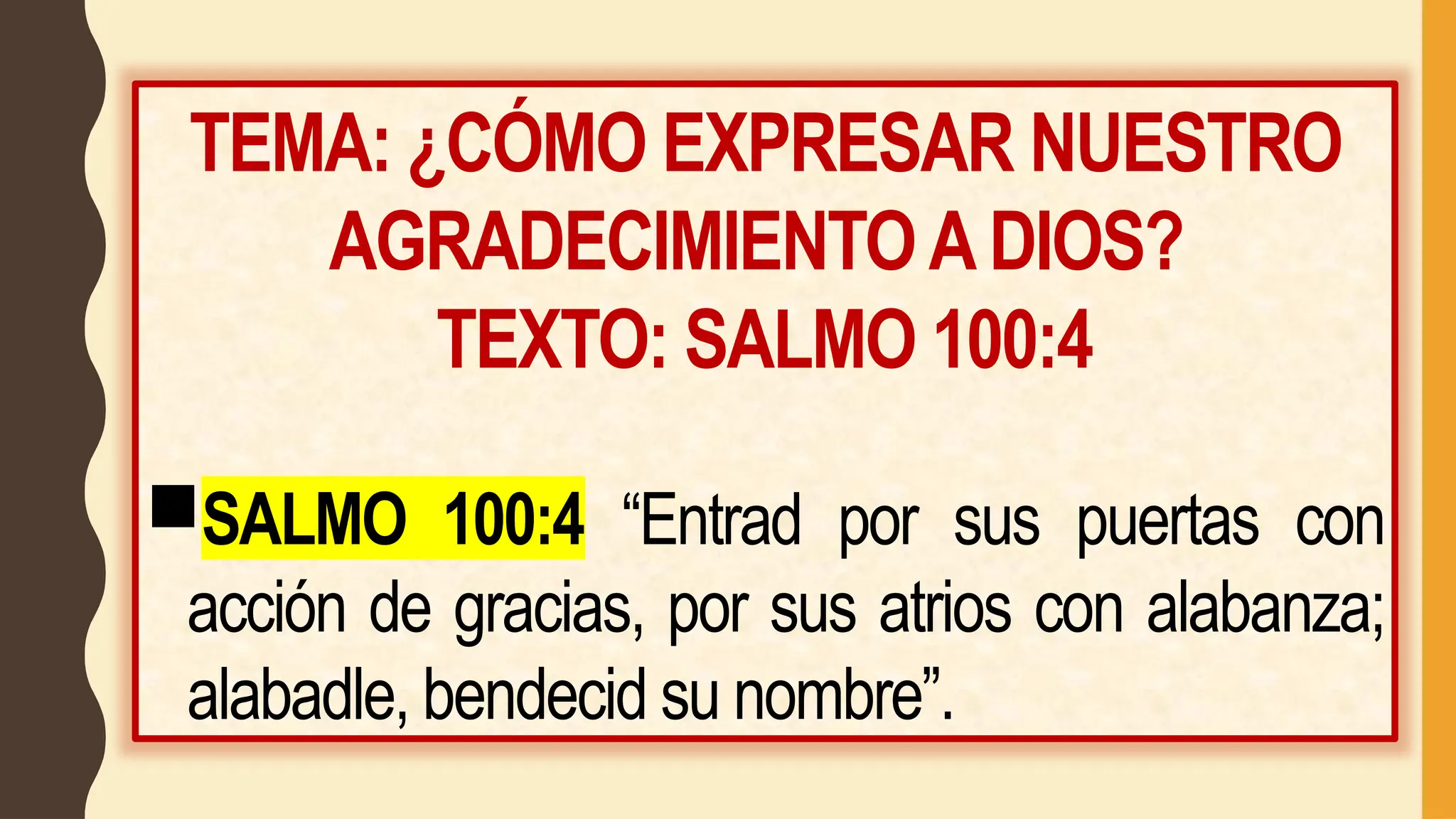 El documento explora cómo expresar agradecimiento a Dios basándose en Salmo 100:4, destacando la importancia de reconocer que todas las bendiciones provienen de Él. Se enfatiza la necesidad de recordar sus misericordias, evitar las obras del mundo y vivir en santidad, así como de amar y obedecer Su Palabra. Concluye que los cristianos deben manifestar su gratitud a Dios a través de acciones que reflejen este agradecimiento.