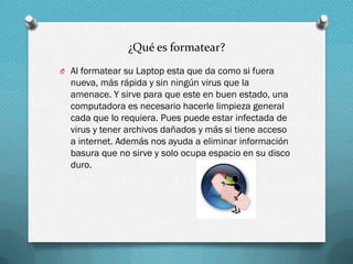 Formatear una laptop significa restaurarla a su estado original, eliminando archivos dañados y virus para mejorar su rendimiento. El proceso implica respaldar la información, descargar controladores, instalar Windows desde un CD, seguir las instrucciones de instalación, e instalar controladores y programas necesarios.