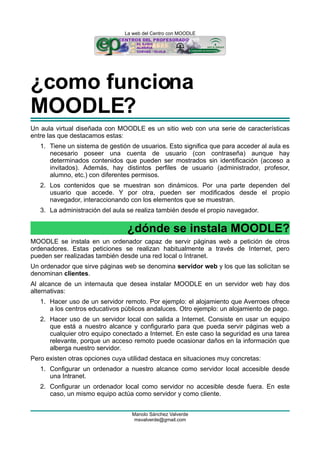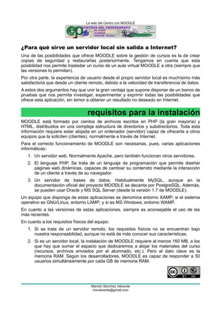 MOODLE es un sistema de gestión de cursos en línea que se instala en un servidor web. Para funcionar correctamente, requiere un servidor web como Apache, PHP para páginas dinámicas, y un servidor de base de datos como MySQL. MOODLE puede instalarse en un servidor remoto o local, y un servidor local sin acceso a Internet puede usarse para copias de seguridad, mejor experiencia de usuario y pruebas sin afectar el sitio público.