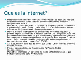 Internet es una red de redes que interconecta computadoras y redes de computadoras a través de diferentes medios como cables, satélites y líneas telefónicas. Está compuesta por hardware como ordenadores, cables y satélites, y software como programas y protocolos de comunicación. Cuando se ingresa a una página web, la computadora se comunica con el servidor que aloja la información usando el protocolo TCP/IP y una dirección IP, y el navegador presenta la página codificada en HTML.