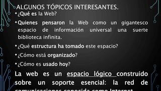 El documento describe cómo funciona la web. Explica que la web es un espacio lógico construido sobre Internet, la cual es la red física que conecta computadores. La web se sustenta en tres pilares: identificadores únicos (URI), lenguaje HTML para describir contenido, y el protocolo HTTP para transmitir datos. También discute el futuro de una capa semántica que permita a agentes de software procesar información de manera similar a los humanos.
