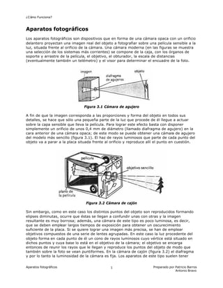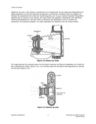 Los aparatos fotográficos funcionan proyectando una imagen real del objeto a fotografiar sobre una película sensible a la luz mediante el uso de lentes y diafragmas. Inicialmente se utilizaban cámaras de agujero simple con un solo orificio, pero producían imágenes borrosas, por lo que luego se desarrollaron cámaras con objetivos compuestos de varias lentes para lograr imágenes más nítidas. Finalmente, se diseñaron cámaras donde el tiempo de exposición y la apertura del dia