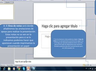 El documento explica las diferentes herramientas y funciones disponibles en la cinta de PowerPoint. Describe cada pestaña y sus grupos de opciones, incluidas Inicio, Insertar, Vista, y Archivo. También cubre cómo crear nuevas presentaciones, abrir archivos existentes, guardar cambios, y utilizar plantillas y temas.