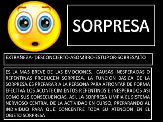 Este documento describe las principales emociones humanas, incluyendo la sorpresa, la ira, el enojo, el miedo, la tristeza, el interés y la alegría. Para cada emoción, explica brevemente su función adaptativa, cómo se manifiesta en el plano neurológico, conductual y cognitivo, y cómo puede gestionarse en situaciones de conflicto.