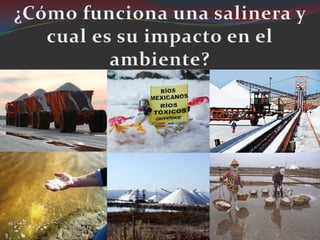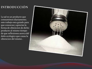 El documento describe los métodos de producción de sal y sus impactos ambientales. La sal se obtiene principalmente a través de la evaporación del agua de mar en salinas costeras o del agua subterránea rica en sal en el interior. Sin embargo, la extracción de sal a gran escala tiene efectos negativos como la pérdida de hábitat y la contaminación de suelos y aguas con desechos salinos tóxicos. Se necesitan mejores prácticas para mitigar el daño ecológico causado por la industria salinera.