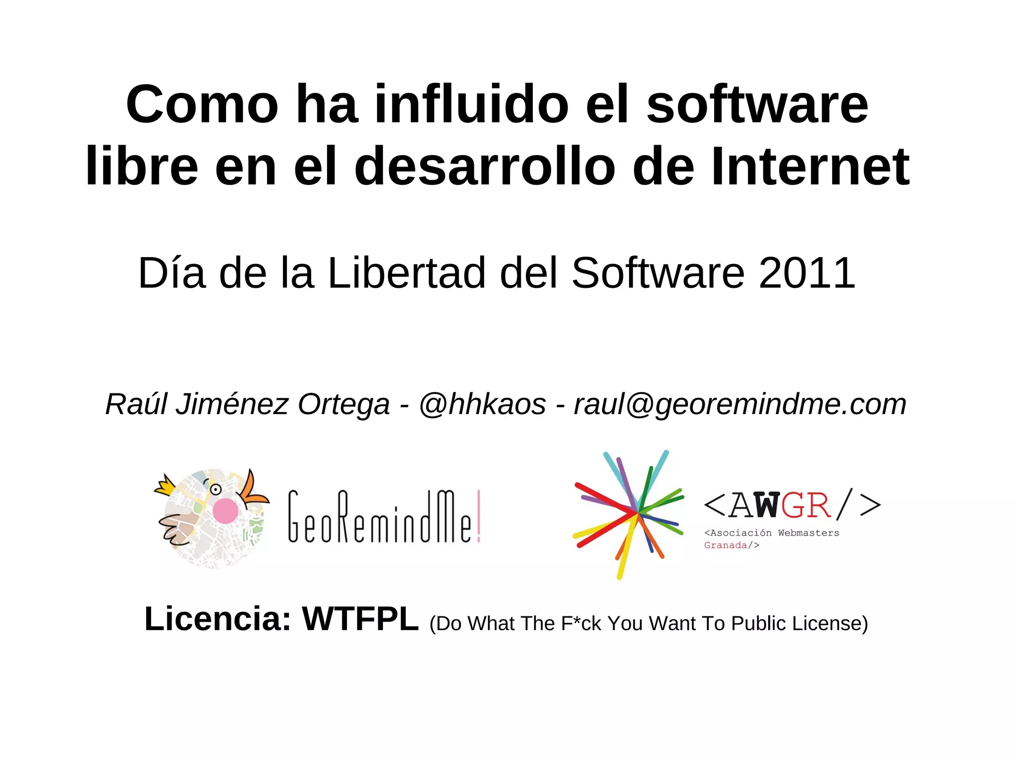 El documento analiza la influencia del software libre en el desarrollo de Internet, destacando su papel fundamental en la creación de herramientas accesibles y colaborativas. Se menciona el crecimiento del acceso a Internet y la importancia de la libertad en el uso del software, abogando por su disponibilidad y modifiabilidad. También se aborda el potencial futuro del software libre para transformarse en un fenómeno comparable al de Internet en los años 90.