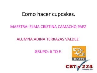 El documento describe cómo hacer cupcakes en 3 pasos: 1) Precalentar el horno a 180°C y preparar los moldes. 2) Mezclar los ingredientes secos y luego los líquidos por separado y luego combinarlos. Dividir la mezcla en los moldes. 3) Hornear los cupcakes durante 20 minutos hasta que un palillo salga seco y dejar enfriar.