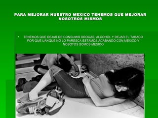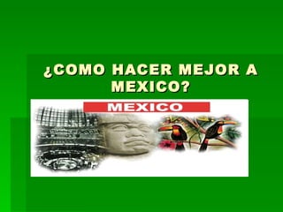Para mejorar México, las personas deben mejorar sus propias acciones al dejar de consumir drogas y alcohol, dejar de contaminar tirando basura en la calle, y acabar con la corrupción en el país quitando a los policías corruptos. Si todos trabajan juntos para practicar valores positivos y ser mejores ciudadanos, se podría empezar a cambiar y mejorar a México para las generaciones futuras.