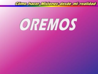 El documento describe cómo hacer misiones desde la propia realidad, analizando ejemplos bíblicos como Abraham y Pablo. Señala que el éxito de Abraham consistió en obedecer, creer las promesas de Dios, y recibir su bendición. También analiza la realidad de Pablo y su equipo misionero, así como conceptos como la guerra espiritual y la preparación de nuevas generaciones. Alienta a evaluar la propia realidad y dones para servir a Dios de acuerdo a ello, siguiendo el ejemplo de personas que hicieron