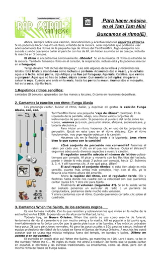 Este documento presenta sugerencias para enseñar a niños a encontrar y crear ritmos musicales usando el TamTamMini. Propone cantar canciones como "Funga Alasia" y "When the Saints" para practicar ritmos, y discute cómo ajustar los instrumentos de percusión en la caja de ritmos del TamTamMini. También recomienda aprender otras canciones populares de África y América Latina que incorporan elementos rítmicos y culturales africanos.