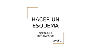 El documento explica cómo realizar un esquema sobre el proceso de hominización basado en información del libro de texto. Se detalla el procedimiento para anotar características de distintos homínidos, comenzando con el ardipithecus, y la forma de relacionarlas con la 'llave' correspondiente. Al final, se sugiere realizar una 'llave' general para completar el esquema.