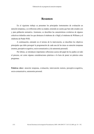El documento describe los principales instrumentos de evaluación utilizados en la atención temprana como las Escalas Bayley de Desarrollo Infantil y la Escala para la Evaluación de la Conducta del Recién Nacido de Brazelton. También discute la importancia de evaluar aspectos cualitativos como la interacción entre el niño y su entorno familiar en lugar de centrarse sólo en resultados de pruebas. Además, destaca la necesidad de adaptar los métodos de evaluación a las características particulares de cada niño.