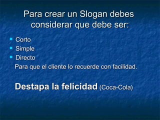 El documento ofrece consejos para crear un slogan efectivo para una empresa, indicando que debe ser corto, simple y directo para que los clientes lo recuerden fácilmente. Además, sugiere que un slogan puede describir la misión de la empresa, incluir un beneficio o resaltar el valor agregado de la marca.