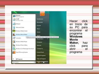 Este documento proporciona instrucciones para crear un video utilizando el programa Windows Movie Maker. Explica cómo agregar fotos, títulos, música y efectos especiales al video. También describe cómo guardar el video completo para subirlo a YouTube u otras plataformas de video.
