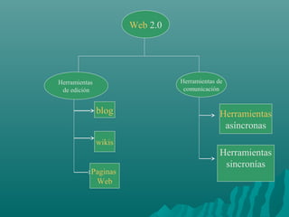 El documento describe las herramientas y características clave de la Web 2.0, incluyendo blogs, wikis, páginas web, herramientas de comunicación sincrónicas y asíncronas. Estas herramientas fomentan la colaboración entre usuarios y la creación de comunidades en línea a través de servicios como redes sociales, blogs y wikis.