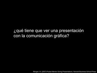 El documento discute los aspectos visuales efectivos de las presentaciones. Señala que las presentaciones deben ser simples, usar gráficos para reforzar puntos clave, incluir una idea por diapositiva con pocas líneas de texto, usar color e imágenes de manera moderada, emplear dos tipografías a lo máximo, y reservar las MAYÚSCULAS solo para títulos. El objetivo es mantener la atención de la audiencia y ayudar a comprender y recordar los mensajes principales.