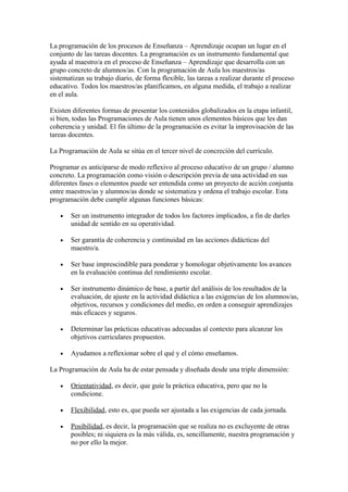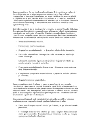 Este documento describe los elementos clave de la programación de aula y las unidades didácticas en la etapa infantil. Explica que la programación sistematiza el trabajo diario del maestro de forma flexible y evita la improvisación. Luego detalla los componentes fundamentales que debe tener una unidad didáctica como objetivos, contenidos, actividades y evaluación, así como criterios para seleccionar actividades significativas para los niños. Finalmente, enfatiza que la evaluación debe ser continua y cualitativa para ayudar a cada niño de acuerdo a sus neces
