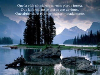 Este documento explora diversos temas relacionados con la vida y las relaciones humanas. Discute que la vida no tiene normas establecidas y que es importante buscar equilibrio entre el amor y el odio, la apertura y los límites. También habla sobre la importancia de pedir y dar ayuda a los demás, de construir puentes en lugar de muros, y de vivir plenamente aprovechando cada momento.