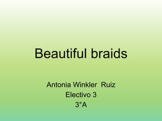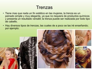 El documento habla sobre las trenzas como peinado. Menciona que las trenzas tienen un fin estético y son un peinado simple y elegante que puede realizarse en todo tipo de cabello. Explica que existen diversos tipos de trenzas y que se pueden usar en diferentes ocasiones tanto formales como informales. También incluye algunos ejemplos de trenzas mezcladas con flores que son populares actualmente y recomienda ver tutoriales de video para aprender a hacer trenzas.