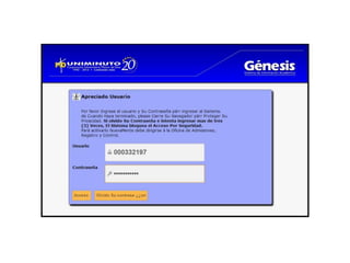 Este documento proporciona instrucciones sobre cómo acceder y navegar por el sistema Genesis de la universidad. Explica que los usuarios deben ingresar su ID y contraseña correctamente para acceder, y que después de 3 intentos fallidos la cuenta se bloqueará. Una vez dentro, los usuarios encontrarán información personal y opciones relacionadas con el alumno y la ayuda financiera, como horarios de clase e inscripciones.