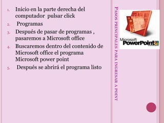 Este documento proporciona instrucciones sobre cómo ingresar a Microsoft PowerPoint y sus principales características. Explica que para abrir PowerPoint debe hacer clic en "Programas" en la barra de menú y luego seleccionar "Microsoft Office" y "Microsoft PowerPoint". Además, describe que PowerPoint es un programa de presentaciones que permite agregar texto, diseños, animaciones e imágenes para crear diapositivas fáciles de entender.