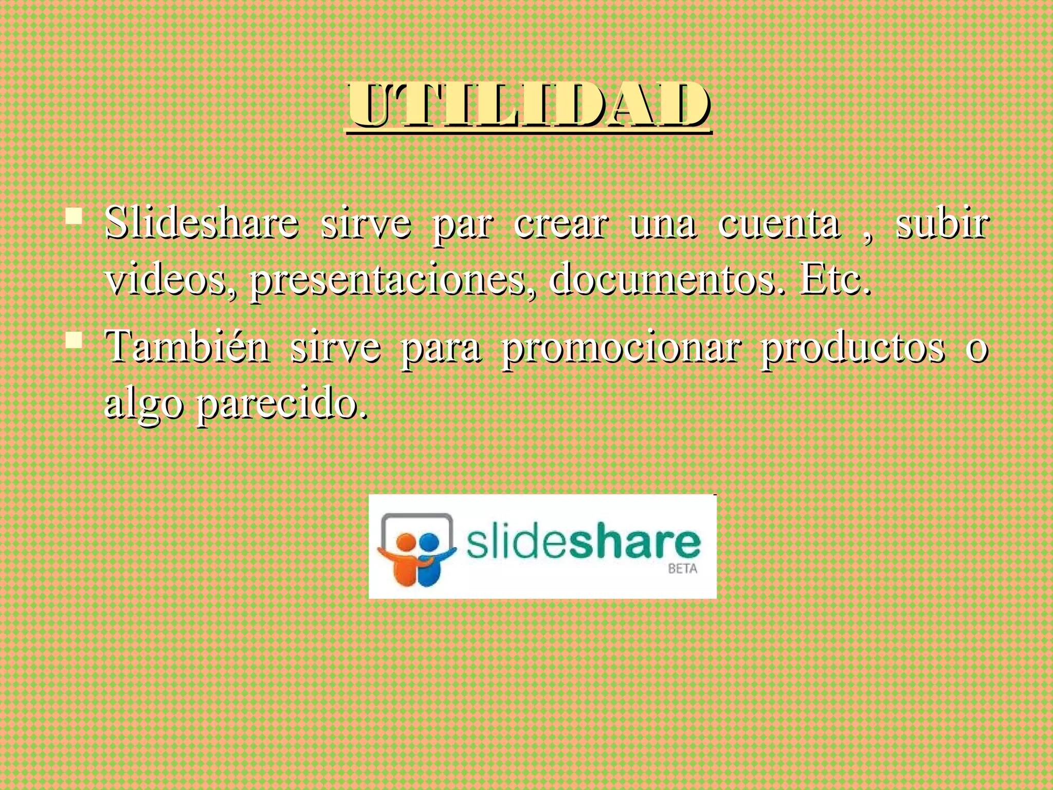 Slideshare es una aplicación web que permite almacenar presentaciones de diapositivas. Los usuarios pueden crear una cuenta, subir videos, presentaciones y documentos. Slideshare convierte las presentaciones a formato Flash para que se puedan ver desde cualquier máquina con internet. Para usar Slideshare se requiere tener una cuenta de correo electrónico y una presentación en PowerPoint u OpenOffice de menos de 10MB, así como un navegador web actualizado y una conexión a internet de velocidad promedio.