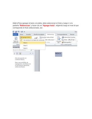 El documento describe 6 pasos para insertar una tabla de contenido en Microsoft Word: 1) seleccionar "Tabla de contenido" en la pestaña "Referencias", 2) agregar la tabla de contenido, 3) seleccionar títulos y agregarlos al índice, 4) ver los títulos agregados a la izquierda, 5) actualizar la tabla para reflejar cambios, 6) ver el índice finalizado. Siguiendo estos pasos, los usuarios pueden crear automáticamente un índice para su documento.