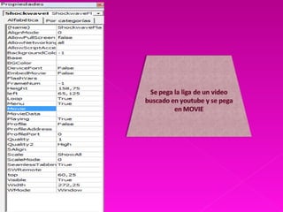El documento proporciona instrucciones para configurar opciones en una cita y mostrar la ficha de un programador. Indica que se debe seleccionar la opción de mostrar la ficha del programador, hacer clic en el icono de PowerPoint, ir a la barra de inicio y seleccionar una opción. También menciona ir a un programador para ver un icono, seleccionar una opción en controles relacionada con Shockwave Flash y aceptarla, y diseñar o seleccionar un cuadro para configurar sus propiedades.