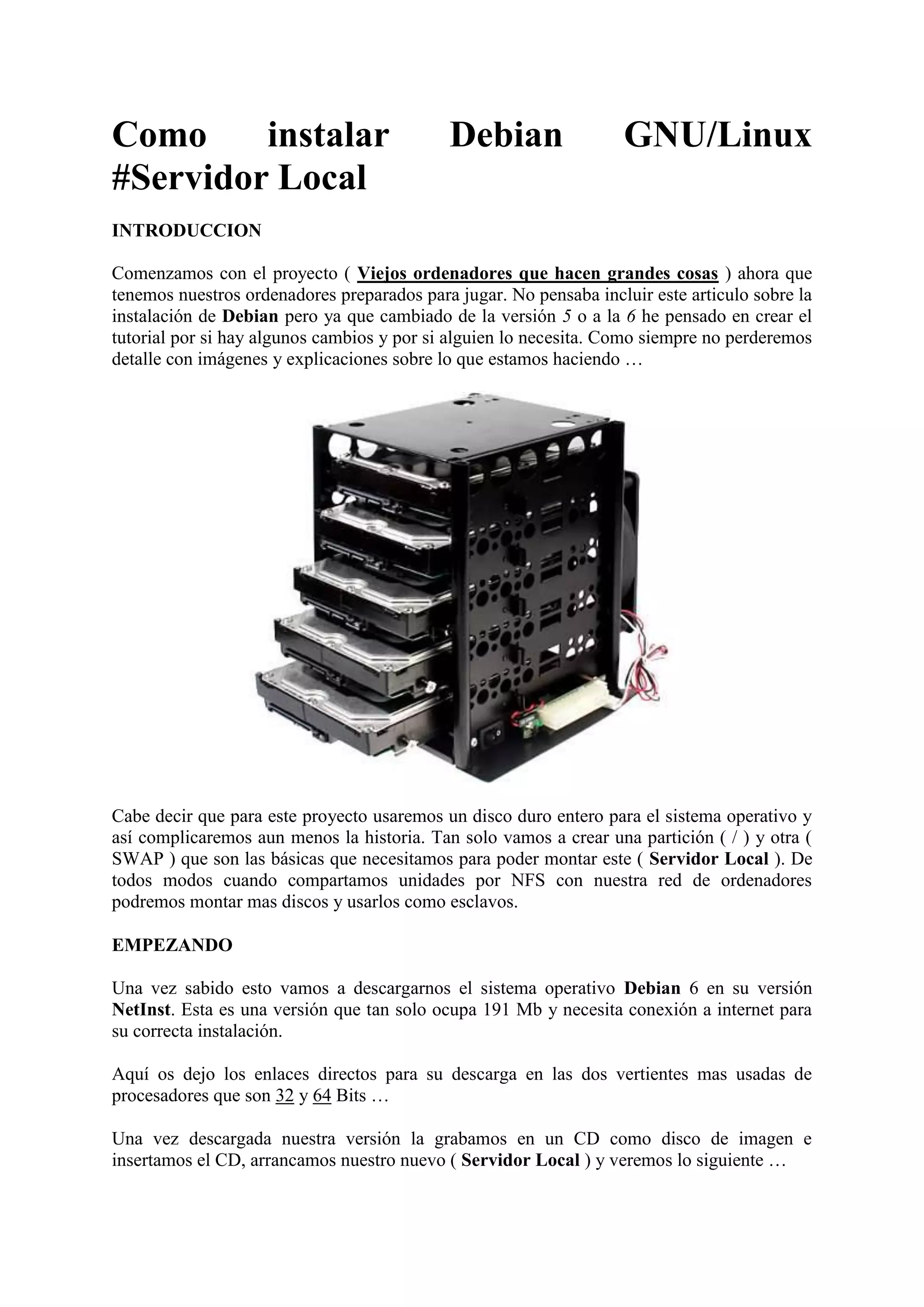 Este documento proporciona instrucciones para instalar Debian GNU/Linux en un servidor local. Explica cómo descargar la versión NetInst de 191 MB, grabarla en un CD e iniciar la instalación. Guía al usuario a través de los 25 pasos de la instalación, incluyendo la creación de particiones, establecimiento de contraseñas de usuario y root, selección de zona horaria y paquetes, e instalación del servidor SSH. Una vez instalado, recomienda usar el comando "top" para monitorear el rendim