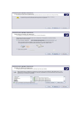 Este documento proporciona instrucciones en 10 pasos para instalar una impresora conectada al ordenador. Estos pasos incluyen seleccionar el puerto de conexión de la impresora, instalar los controladores de software del fabricante o de Windows, asignar un nombre a la impresora, seleccionar si será la impresora predeterminada, e imprimir una página de prueba para verificar la instalación.