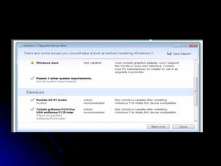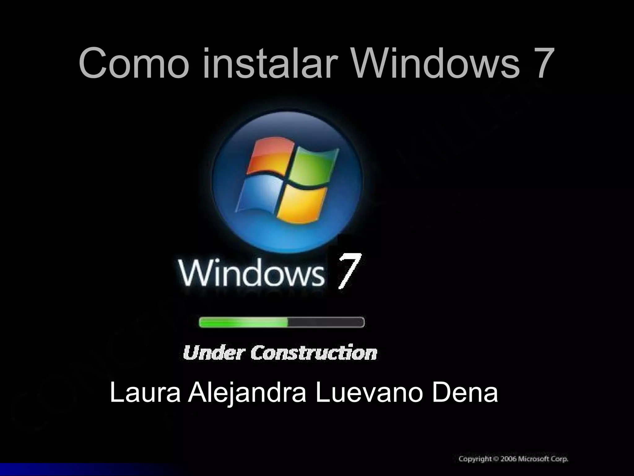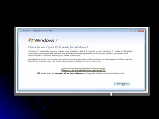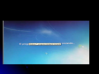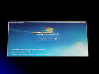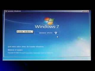 El documento proporciona instrucciones para instalar Windows 7. Explica los requisitos mínimos como un procesador de 1 GHz, 1 GB de RAM y espacio en disco duro. Luego describe los pasos para instalar, que incluyen crear particiones, arrancar desde el DVD y seguir las instrucciones en pantalla para configurar la cuenta de usuario, contraseña, idioma y otros ajustes. Una vez completada la instalación, el sistema operativo estará listo para usar.