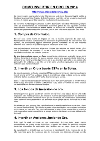 El documento detalla las diversas formas de invertir en oro, incluyendo la compra de oro físico, fondos cotizados en bolsa (ETFs) y acciones de empresas mineras. A medida que el dólar disminuye su valor, el oro tiende a aumentar, sirviendo como un refugio ante la inestabilidad económica. Se exploran opciones tanto conservadoras como especulativas, adecuadas para diferentes niveles de experiencia y tolerancia al riesgo.