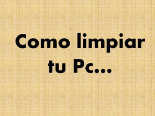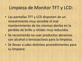 Este documento ofrece instrucciones para limpiar varias partes de una computadora, incluyendo el monitor, mouse, teclado y la unidad central (CPU). Explica que para limpiar el monitor se debe usar un trapo suave en lugar de productos abrasivos. Para limpiar el mouse, se debe extraer la bola y limpiar los rodillos. El teclado se debe limpiar dando la vuelta, sacudiendo y limpiando entre las teclas. La CPU se debe limpiar con una brocha, aspiradora y aire a presión para retirar el polvo de los ventil