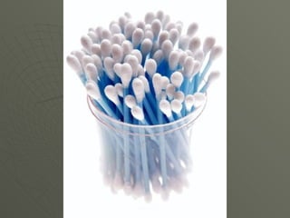 El documento explica que el oído se limpia solo a través de glándulas que producen cerumen y cilios que lo expulsan. Usar hisopos u otros objetos para limpiar los oídos solo empuja la cerilla hacia adentro y puede perforar la delicada membrana timpánica, causando problemas auditivos. En lugar de eso, solo dejar que entre agua en la ducha para limpiar los oídos de forma natural y segura.