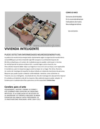 Un centro de investigación español ha desarrollado una casa inteligente con sensores que pueden detectar indicadores de enfermedades neurodegenerativas como el Alzheimer mediante el monitoreo de personas mayores en sus hogares. El sistema podría ayudar a mejorar el cuidado y la calidad de vida de las personas mayores.