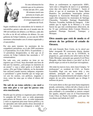 El documento habla sobre la deuda pública de Oaxaca heredada por el gobierno de Ulises Ruiz y las acusaciones de corrupción contra ex funcionarios de su administración como Armando González Bernabé, quien se habría apropiado indebidamente de 736 millones de pesos. También menciona a varias empresas fantasmas que recibieron contratos por más de 74 millones de pesos durante el último año del gobierno de Ruiz.