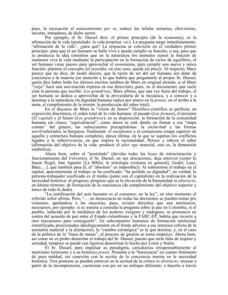 Este documento discute las críticas del filósofo Enrique Dussel al marxismo-leninismo. Se argumenta que Dussel simplifica irresponsablemente al marxismo-leninismo y su praxis histórica. Mientras que algunas críticas de Dussel al eurocentrismo son válidas, también se presentan objeciones a ciertas visiones utópicas y hedonistas propuestas por Dussel. El documento defiende que Lenin y Stalin fueron marxistas que desarrollaron la teoría para las condiciones rusas y logr
