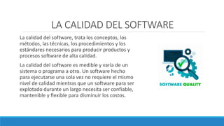 La calidad del software se puede medir mediante estándares como ISO 9000 e ISO 9003, CMMI y SPICE. Se utilizan diferentes tipos de indicadores y métricas para medir la calidad del software a nivel de proceso, proyecto y producto. Algunos factores importantes de calidad incluyen la funcionalidad, confiabilidad, usabilidad, eficiencia y capacidad de mantenimiento.