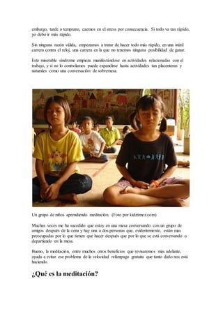 La meditación puede ayudarnos a controlar mejor nuestra mente y reducir el estrés. Practicar la meditación diariamente por al menos 15-20 minutos nos permite enfocarnos mejor y reducir los pensamientos divagantes. Varios estudios muestran que la meditación aumenta la densidad de la corteza cerebral y mejora la capacidad de procesar información y reaccionar más rápido. La meditación sólo requiere voluntad, tiempo y un lugar tranquilo, y sus beneficios se ven a largo plazo con la práctica constante.