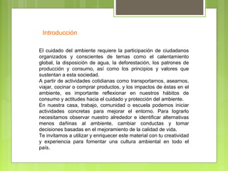 El documento habla sobre la importancia de la participación ciudadana en temas ambientales como el calentamiento global y la protección de recursos. Señala que desde nuestras actividades cotidianas y hábitos de consumo podemos iniciar cambios a favor del medio ambiente, como observar nuestro entorno para identificar alternativas menos dañinas y tomar decisiones que mejoren la calidad de vida. Finalmente, invita a utilizar este material de manera creativa para fomentar una cultura ambiental.