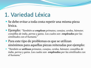 Este documento presenta tres principios para mejorar la calidad de la escritura: 1) Variedad léxica, evitando repetir palabras usando sinónimos. 2) Extensión oracional, evitando oraciones muy largas que dificultan la claridad. 3) Recurrencia, retomando temas planteados para dar coherencia al texto. Se proveen ejemplos que ilustran estas recomendaciones.