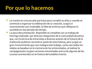 El documento describe un proyecto de la Escuela Técnica N°1 de Roque Pérez para documentar la remodelación del edificio escolar a través de fotografías y videos publicados en redes sociales. El proyecto busca que los estudiantes aprendan a usar de manera segura las redes y produzcan material didáctico. El contenido generado se compartirá en un grupo privado de Facebook y en la página web de la escuela.