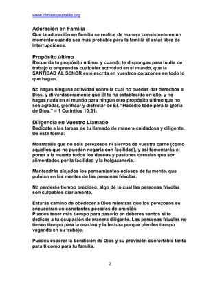 El documento ofrece directrices para pasar el día de manera santa, incluyendo: 1) comenzar el día con oración y meditación; 2) dedicarse diligentemente al trabajo asignado y redimir el tiempo; 3) vigilar las tentaciones y pecados predominantes y arrepentirse rápidamente de cualquier caída. El objetivo es glorificar a Dios en todas las acciones y prepararse mejor para la eternidad.