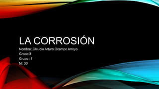 El documento aborda la corrosión, definida como el ataque destructivo de metales por reacciones químicas o electroquímicas, y detalla métodos para proteger materiales metálicos, especialmente acero, de este fenómeno. Se presentan cinco métodos de protección, incluyendo el uso de acero inoxidable, galvanización y recubrimientos especiales, además de un experimento que muestra cómo la glicerina puede prolongar la vida útil del metal. También se menciona la corrosión húmeda y seca, además de los costos económicos asociados al deterioro por corrosión.
