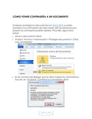 Este documento explica cómo poner una contraseña de protección a documentos de Word 2010 para que solo personas con la contraseña puedan abrirlos. Se debe abrir el documento en Word, ir a Archivo > Información > Proteger documento > Cifrar con contraseña, ingresar la contraseña en la ventana de diálogo y hacer clic en Aceptar para proteger el documento con esa contraseña.