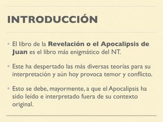 El documento explora el libro del Apocalipsis de Juan, destacando su interpretación histórica y su contexto en la literatura apocalíptica. Se enfatiza que el texto contiene visiones sobre el fin del mundo y debe ser leído sin temor, brindando esperanza y reafirmando la fidelidad a Dios. El autor proporciona pautas para predicar sobre el Apocalipsis, sugiriendo enfoques que alienten la justicia social y fortalezcan la fe en tiempos de prueba.