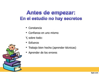 Este documento ofrece consejos para preparar exámenes de forma efectiva, incluyendo la importancia de la constancia, la confianza en uno mismo, el esfuerzo y el aprendizaje de los errores. Recomienda organizar sesiones de estudio diarias de al menos 2-3 horas, en un lugar tranquilo y sin distracciones. Además, propone hacer una lista de tareas, planificar el estudio con calendarios y repartir adecuadamente el tiempo entre las asignaturas.