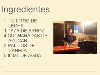 El documento proporciona instrucciones en 4 pasos para hacer arroz con leche. Primero, se hierve agua y se agrega arroz por 10 minutos. Luego, se añade leche, azúcar y canela y se revuelve durante otros 10 minutos a fuego lento. Finalmente, el arroz con leche está listo para comerse después de 10 minutos de cocción.