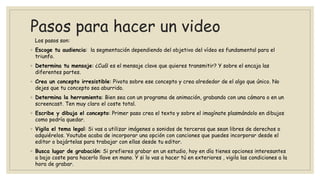 El proceso de realización de un video consta de tres etapas: pre-producción, producción y post-producción. La pre-producción incluye la planificación y preparación, la producción es la grabación, y la post-producción es la edición y manipulación del material grabado.