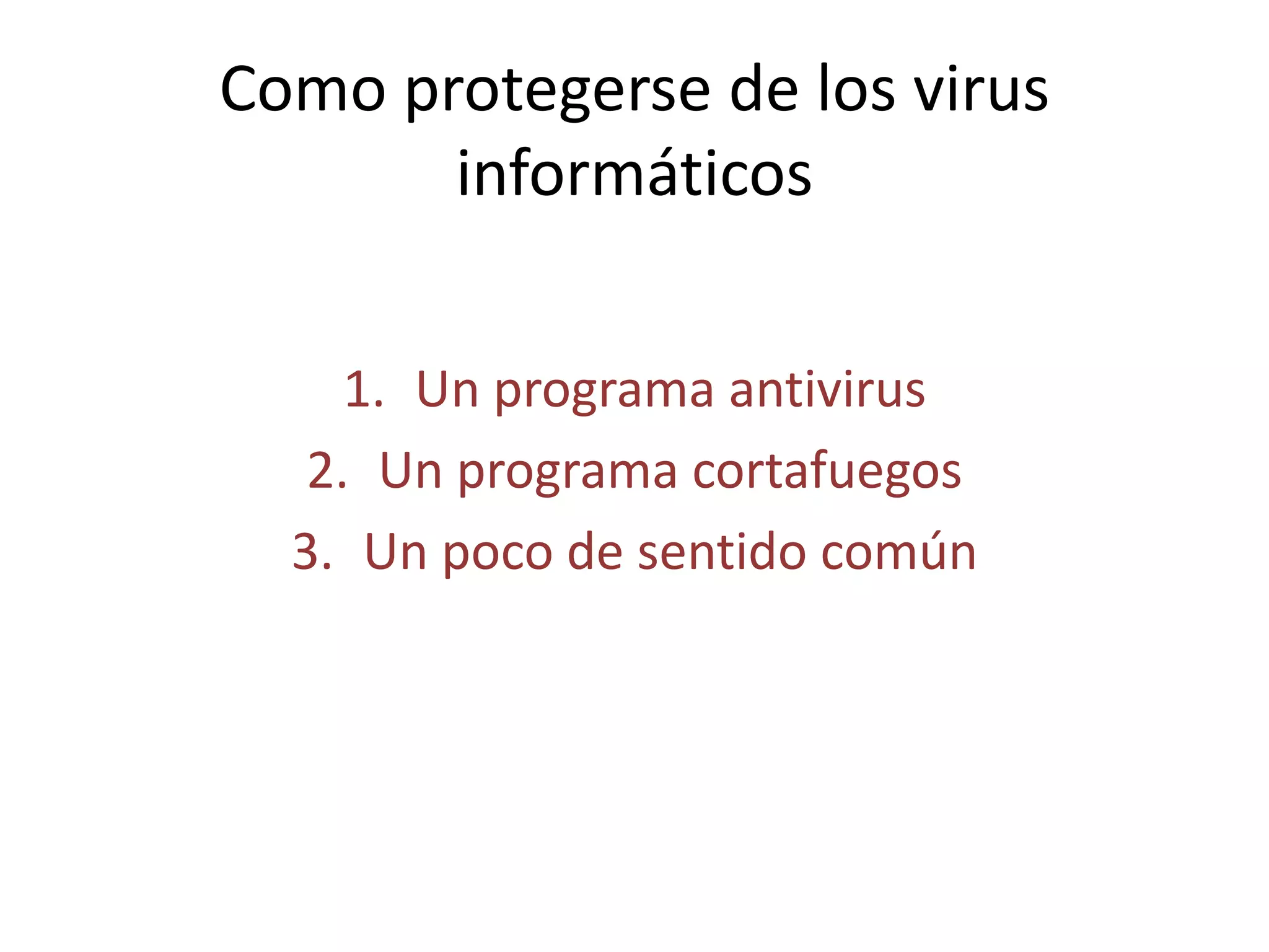 Para protegerse de los virus informáticos, se recomienda usar un programa antivirus y cortafuegos, prestar atención a los archivos adjuntos que se abren, escanear dispositivos de almacenamiento externos antes de abrir archivos, y realizar copias de seguridad de la información.